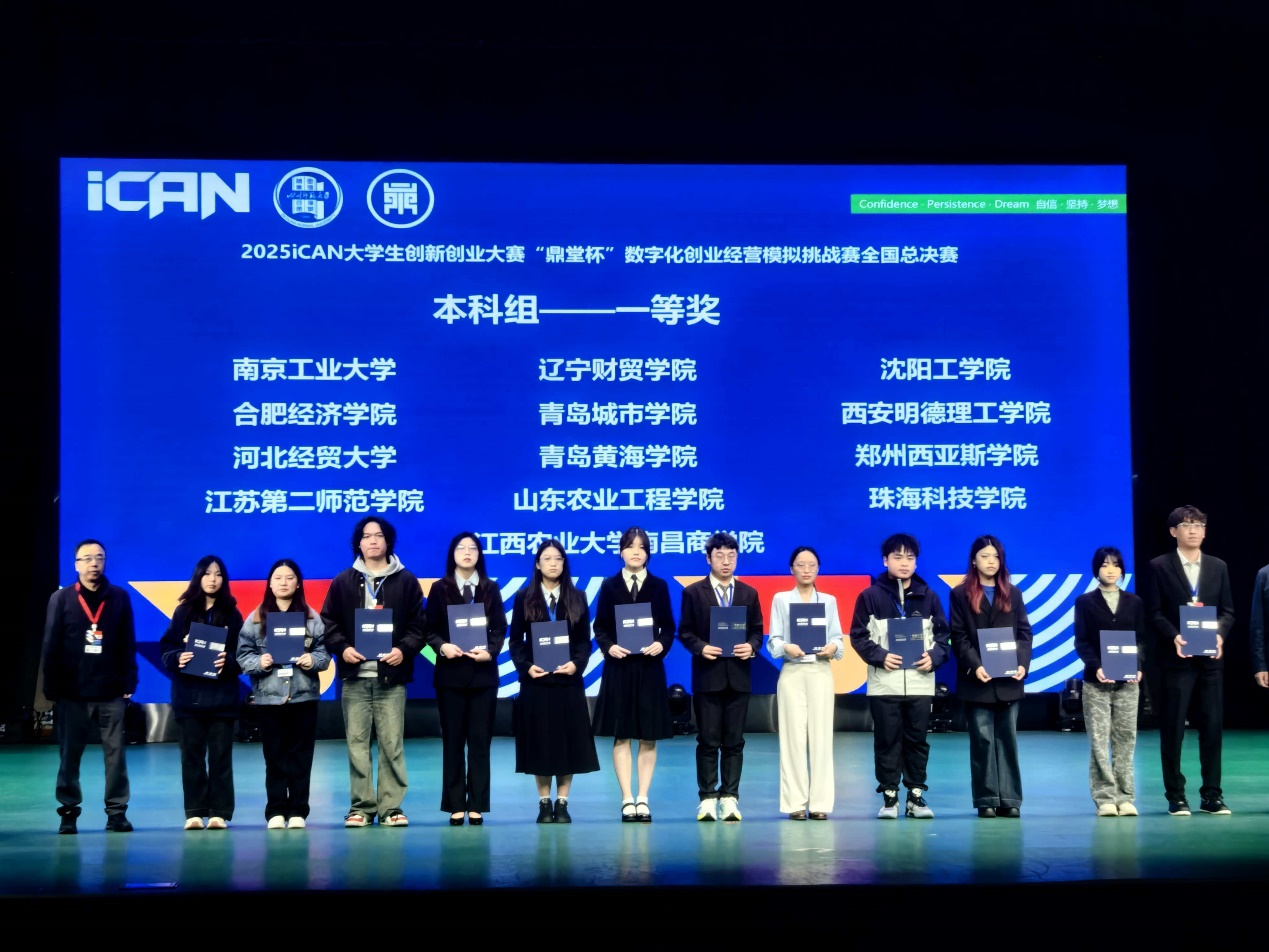 近日,2025iCAN 大学生创新创业大赛 “鼎堂杯” 数字化创业经营模拟挑战赛全国总决赛在四川成都圆满落幕。由方叶祥老师牵头组织、樊树海老师带队的我校“发际总与我作对”参赛团队(队员:朱唐毅、周子然、张默涵),凭借扎实的专业功底、创新的经营策略与高效的团队协作,从全国132支精英队伍中脱颖而出,最终斩获全国一等奖(第一等次),为学校赢得了荣誉。截止发稿时间,今年我校共获得国家一等奖1项、国家三等奖1项,省二等奖2项,省三等奖3项,省优胜奖1项。