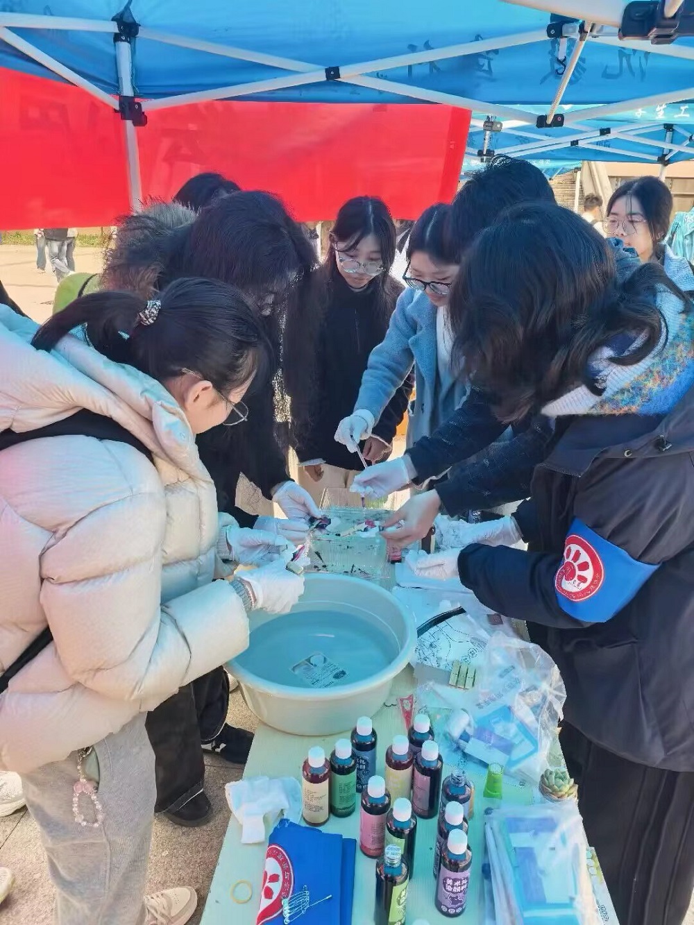 活动现场气氛热烈,同学们在工作人员的引导下,领取扎染布料与工具,通过折叠、捆绑、夹压等技法设计专属纹路,再将织物浸入染料盆中,静待色彩自然晕染。大家相互交流、互帮互助,不少同学还大胆尝试多层扎染、混色搭配等进阶手法,以指尖创意赋予织物鲜活生命力,尽显独特审美与巧思。