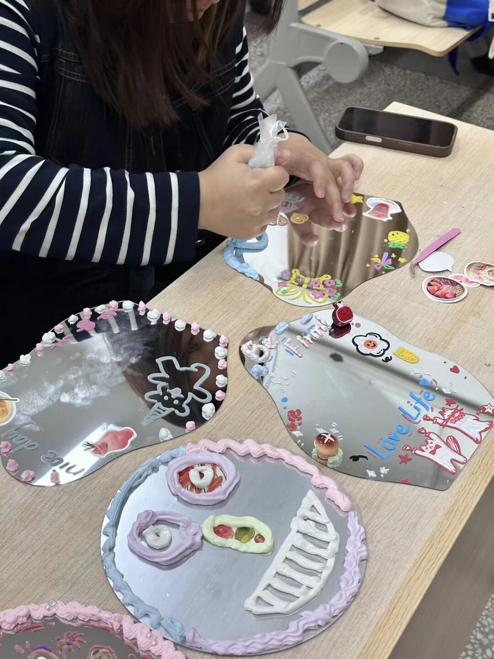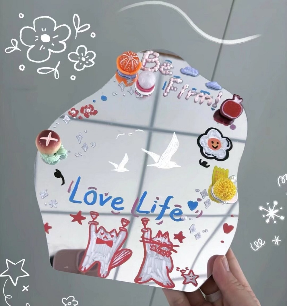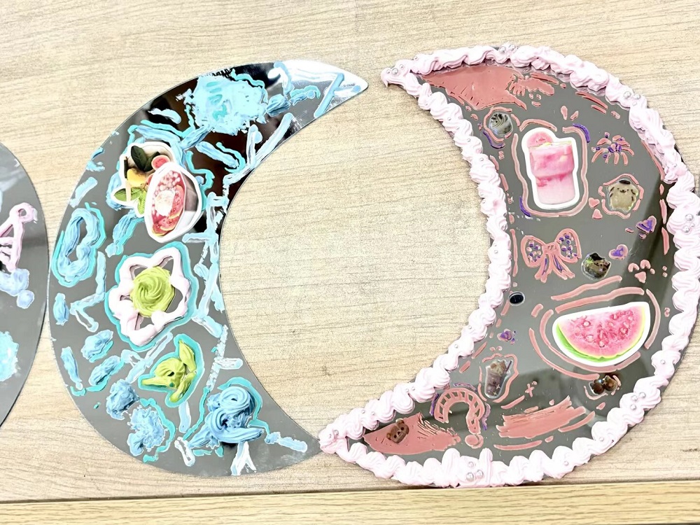 活动现场,同学们早早抵达场地,挑选心仪的镜面尺寸后便迅速投入创作,大家或提笔勾勒线条,或调色晕染色彩,将自己的情绪、热爱与憧憬都倾注于方寸镜面上,绘出独属于自己的心灵风景。