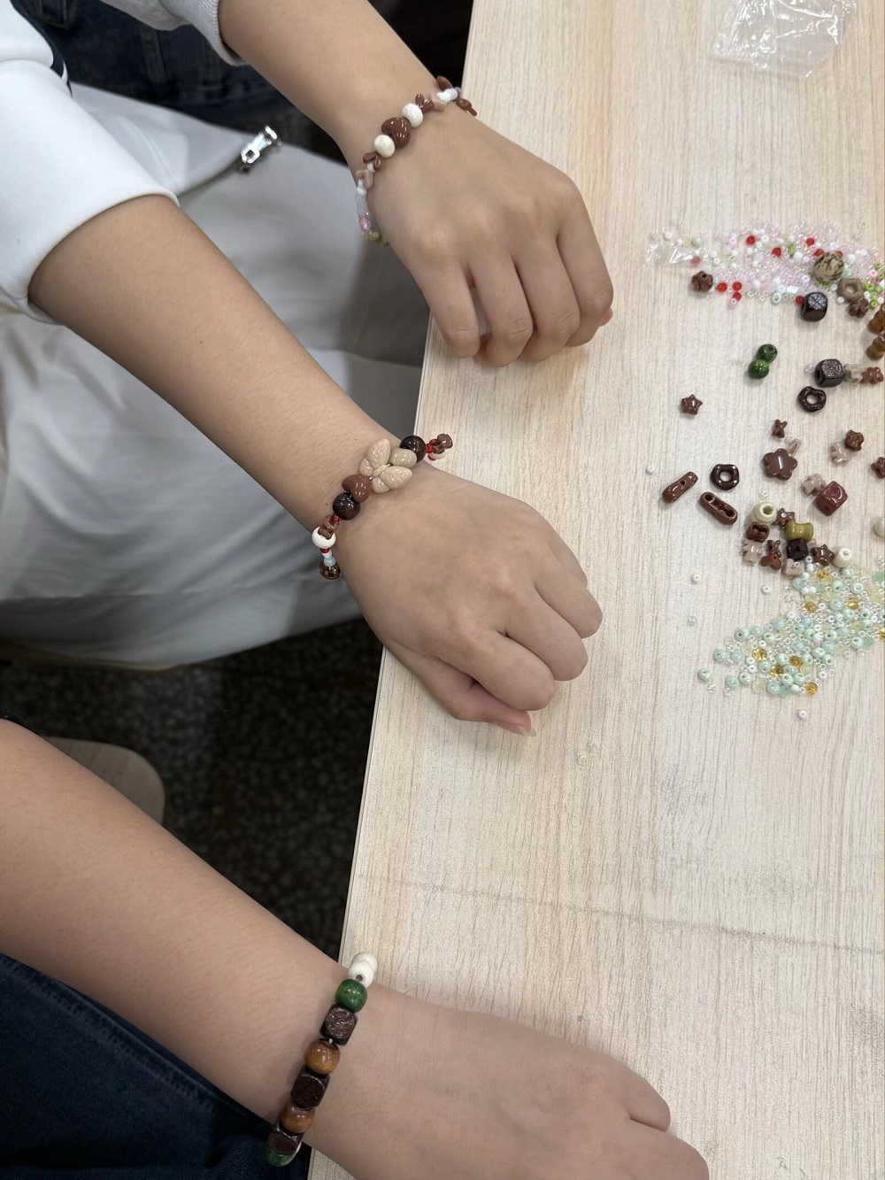 活动现场,同学们迅速投入状态,或静心挑选心仪的珠饰颜色,或认真构思独特的串制样式,穿线、串珠、打结,每一个动作都专注而认真,指尖的灵动间,将细腻的心思与美好的期许融入每一颗珠子之中。活动过程中,同学们相互交流串珠经验,分享生活趣事,偶尔的互助协作更让现场暖意融融。串珠碰撞的清脆声响里,时间缓缓流淌,学业的疲惫在专注中逐渐消解,内心的压力随珠线的延伸慢慢释放,大家在动手实践中享受片刻宁静,在创意表达中滋养心灵。